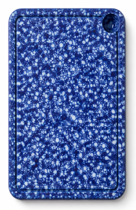 Et stilrent skærebræt i dyb midnatsblå med et levende terrazzo-mønster – skabt til at markere en særlig milepæl. De bløde hjørner og den diskrete udhulning giver et funktionelt design, der både er robust og elegant på køkkenbordet.